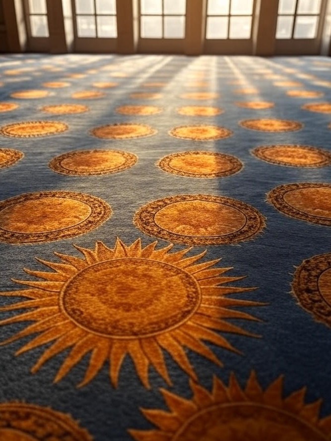 Pola matahari dalam karpet masjid melambangkan cahaya ilahi yang menyinari hati manusia. Selain itu, pola ini memberikan kesan hangat dan optimis di dalam ruangan. Pemilihan karpet masjid berpola matahari juga menambah nilai estetika masjid, menjadikannya lebih indah sekaligus nyaman bagi jamaah.