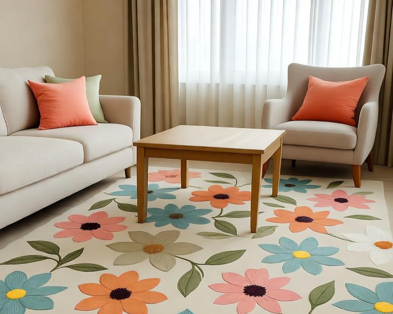 Kombinasi motif bunga dan warna pastel mampu menciptakan suasana lembut dan tenang, ideal untuk ruang yang ingin menonjolkan kehangatan dan keindahan alami. Karpet ini juga bisa menjadi pelengkap sempurna untuk ruangan dengan dekorasi modern maupun klasik.