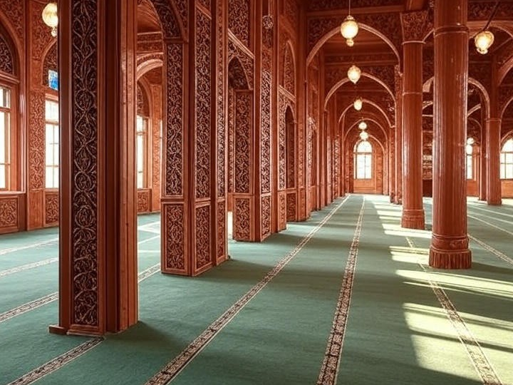 Pengrajin menghiasi interior masjid Betawi dengan ukiran dan ornamen khas. Untuk menjaga keseimbangan visual, pilih karpet dengan motif sederhana, seperti garis penanda saf atau pola geometris yang tidak terlalu mencolok. Jika ornamen interior sudah kaya detail, karpet bermotif polos akan lebih serasi. Masjid yang ingin tampil lebih berani bisa memadukan karpet bermotif islami sederhana tanpa mengganggu keindahan asli.