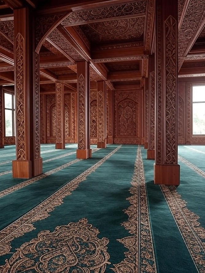 Interior masjid Dayak umumnya memiliki pencahayaan hangat. Pilih karpet dengan tekstur yang dapat memantulkan cahaya lembut agar ruang ibadah terlihat lebih lapang dan terang.